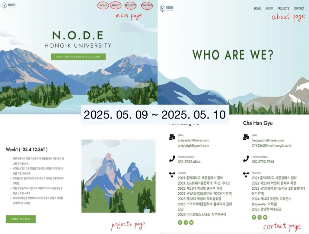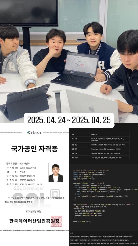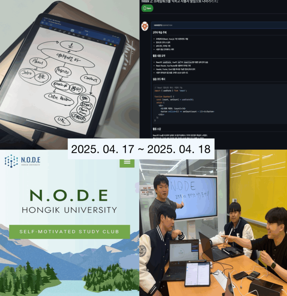project Week1 ( '25.4.12.SAT ) 6H 커뮤니케이션 역량 강화를 위해 팀원들과의 역할 분담 및 소통 방식을 논의.HTML/CSS 기초 문법을 학습하고, 간단한 레이아웃 구조를 직접 구현.포트폴리오 웹사이트의 전체 구성과 디자인 방향에 대해 기획.개발 환경을 Vite 기반으로 세팅하고 GitHub를 활용한 협업 구조를 구축.와이어프레임을 작성하며 페이지 흐름과 콘텐츠 배치를 시각적으로 구상. Code review Week2 ( '25.4.17.THUR ) 4H 프레임워크(React, Vue.js) 기반 프론트엔드 개발 컴포넌트 단위 UI 설계 , 상태관리 , 라우팅 구현사용자 중심 인터페이스 제작 및 다양한 해상도에 대응하는 반응형 웹 구현을 중심으로 학습 code review Week3 ( '25.4.24.THUR ) 4H Node.js와 Express.js를 활용해 RESTful API 서버를 구축하고 라우팅 구조를 설계Postman으로 API 요청을 테스트하며 디버깅 능력과 응답 처리 흐름을 학습MySQL 또는 MongoDB를 연동하고, SQL 문법과 ORM 도구(Prisma/Mongoose)를 활용해 데이터베이스를 효율적으로 관리 방법을 학습JWT를 이용한 로그인 기능 구현을 통해 사용자 인증과 권한 제어의 개념을 실습데이터베이스 설계와 활용에 흥미를 느끼며, 이를 심화하기 위해 SQLD 자격증 취득을 목표로 병행 학습을 시작 및 합격!! code review Week4 ( '25.5.9.FRI ) 6H 이미지 업로드 기능 구현 및 클라우드 저장소 활용법 학습프로젝트 상세 페이지 설계 및 태그 기반 추천 기능 개발관리자 페이지를 통한 작업물 관리 및 통계 기능 구현관리 UI/UX 디자인 개선 및 사용자 관리 구조 설계 CODE REVIEW Talk to us Curious about our projects or want to know more about our club?We’re happy to answer your questions, discuss possible collaborations, or listen to your feedback.Reach out anytime we’d love to connect with you! Get In Touch